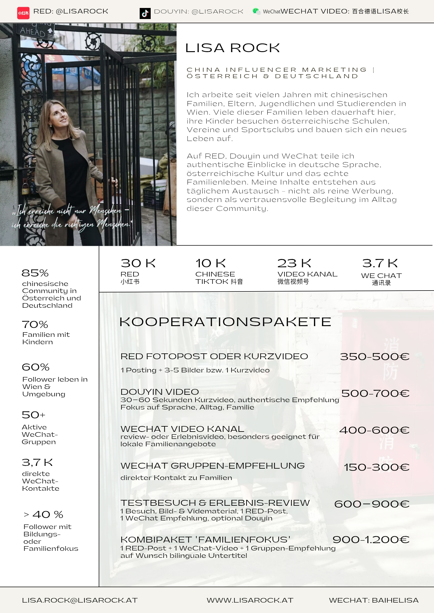 Ich bin Lisa Rock, Gründerin vom Chinazentrum und Spezialistin für die Kommunikation mit chinesischen Familien in Österreich. Über meine Social-Media-Kanäle – Douyin, RED und WeChat Video – erreiche ich eine hochaktive Community, die sich für Leben, Bildung, Kultur und Alltag in Österreich interessiert.